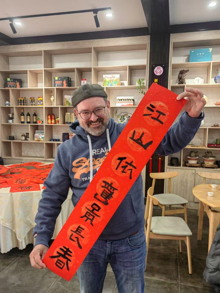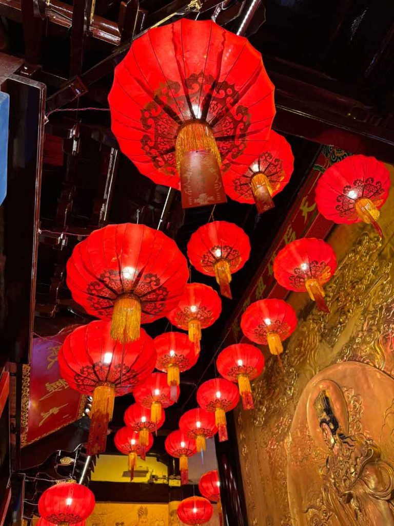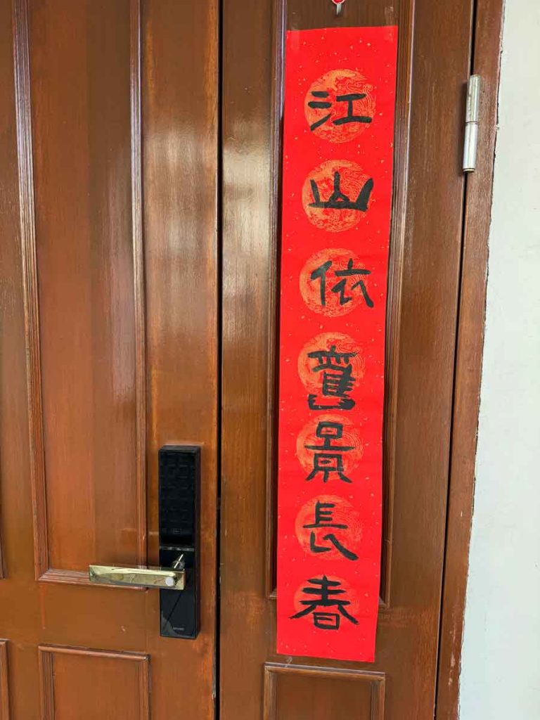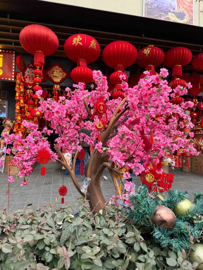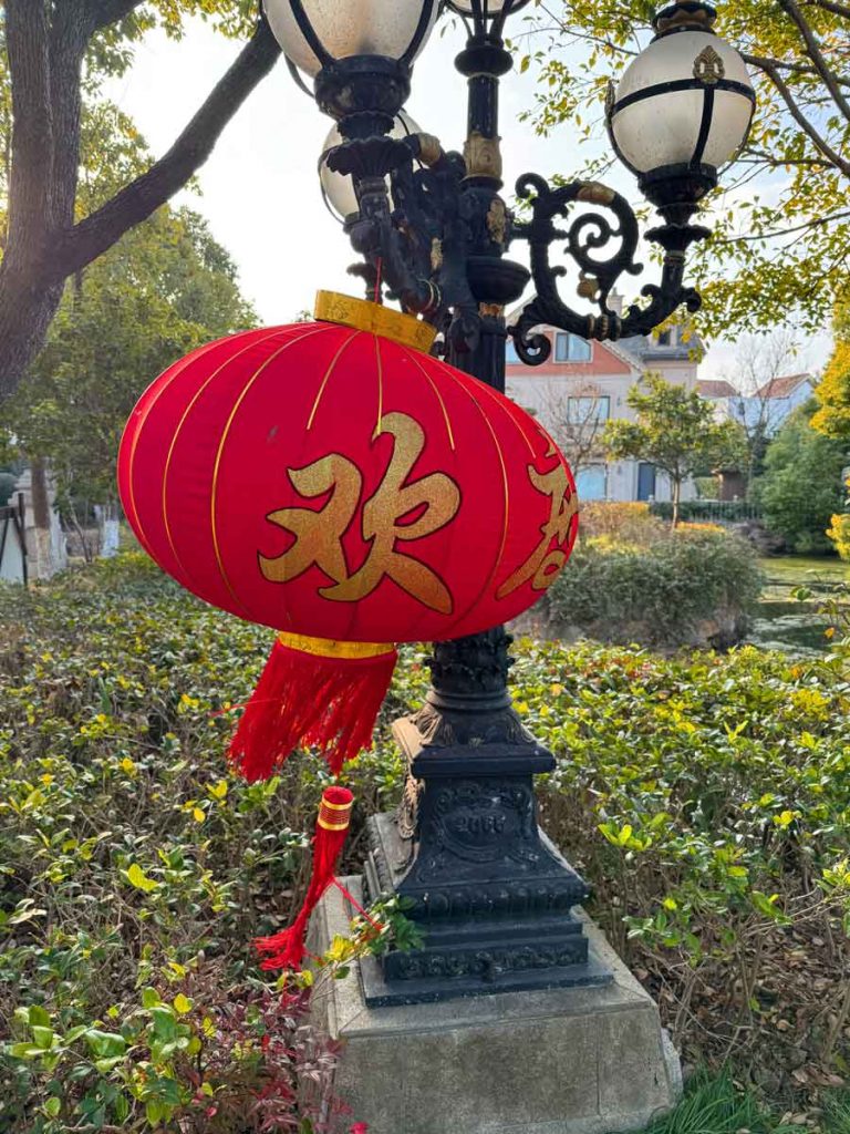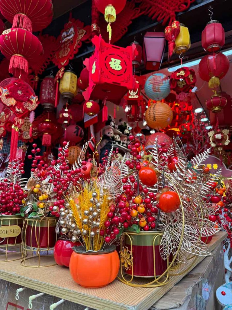 Allgegenwärtig ist die Farbe Rot, sie steht für Wohlstand und Glück: Überall in den Straßen und bei uns in der Siedlung hängen Lampions und die Häuser sind in rot-gold geschmückt. An vielen Haustüren hängen zudem glückverheißende Anhänger und Verse auf rotem Papier. Rote Umschläge mit Geld – die sogenannten hóngbāo – werden an Bekannte, Kollegen und Angestellte verschenkt und man trägt am besten rote Kleidung. Geböllert wird allabendlich schon Wochen vor dem Jahreswechsel und auch danach scheint der Vorrat an Feuerwerkskörpern nie zu enden.