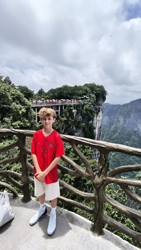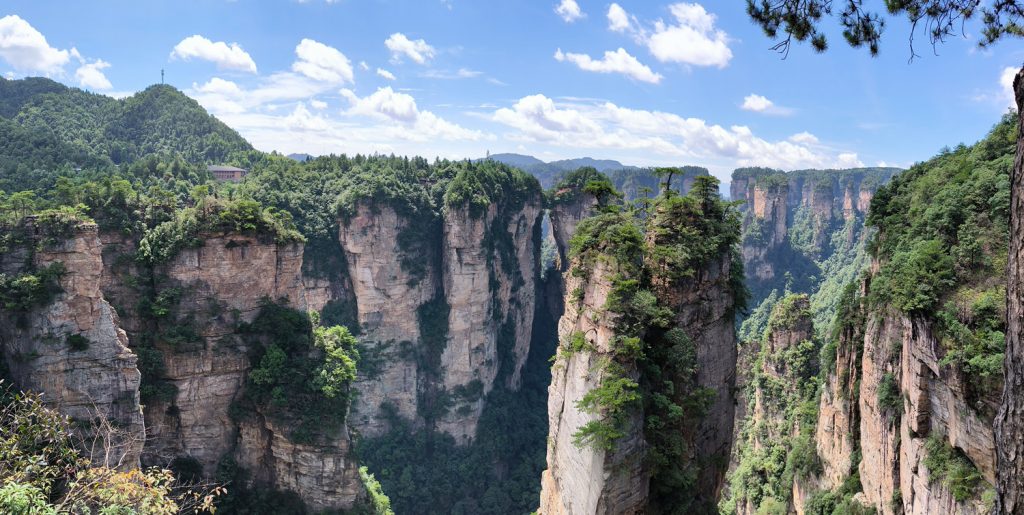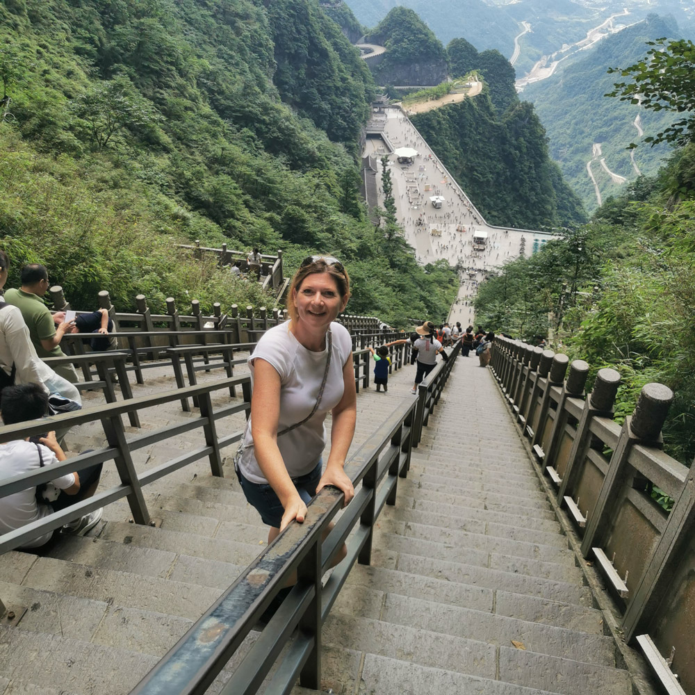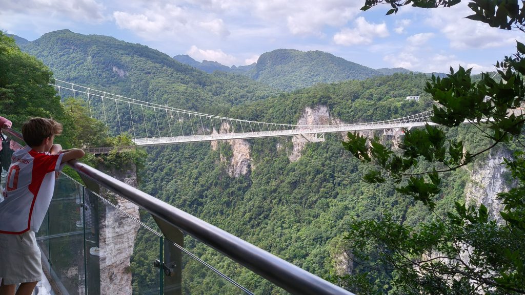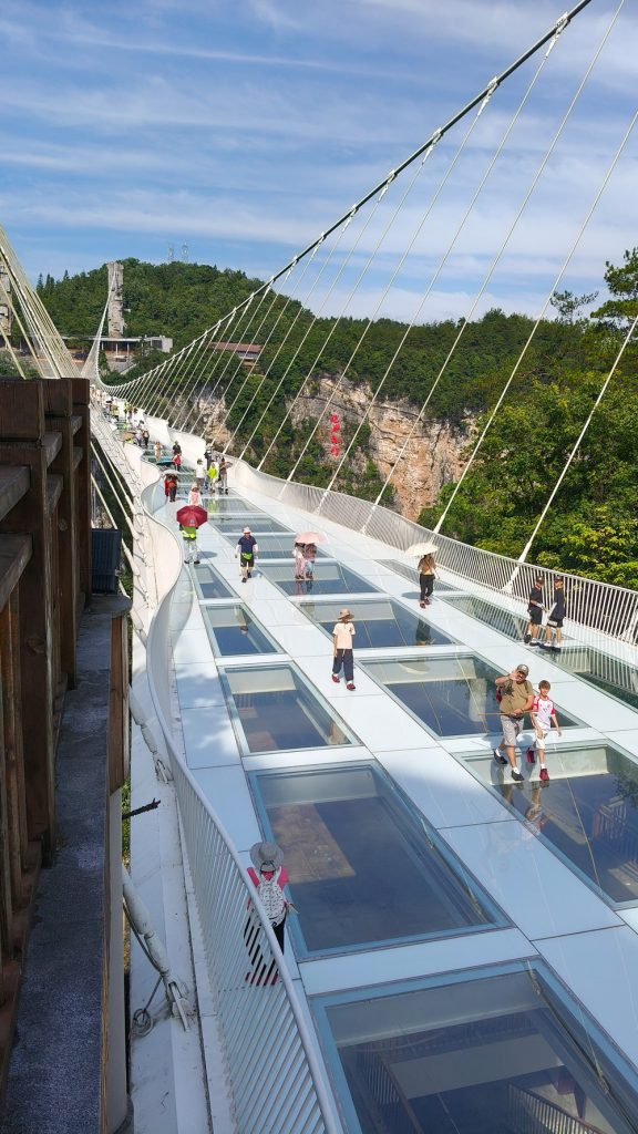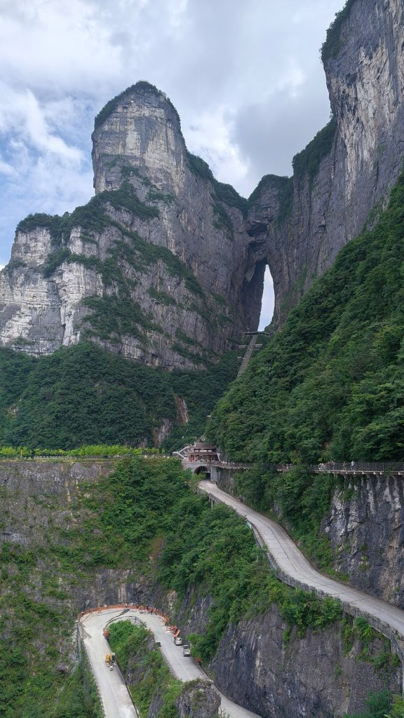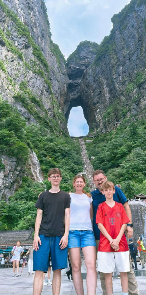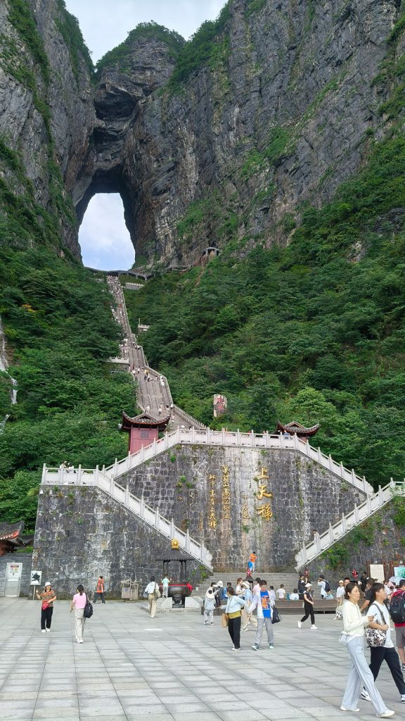 In Hunan, im Zentralosten von China, brachte uns die steilste und längste Seilbahn der Welt (7,4 Kilometer) auf den heiligen Berg Tianmenshan im Zhangjiajie-Nationalpark. Nach einem großen Rundweg, teilweise mit Glasboden, ging es dann im Inneren des Berges – mit tausenden anderen Menschen – auf einer bunt beleuchteten Rolltreppe hinab zum „Himmelstor“ im Fels. Von dort aus ging es 999 Stufen runter zur Aussichts-Terrasse.