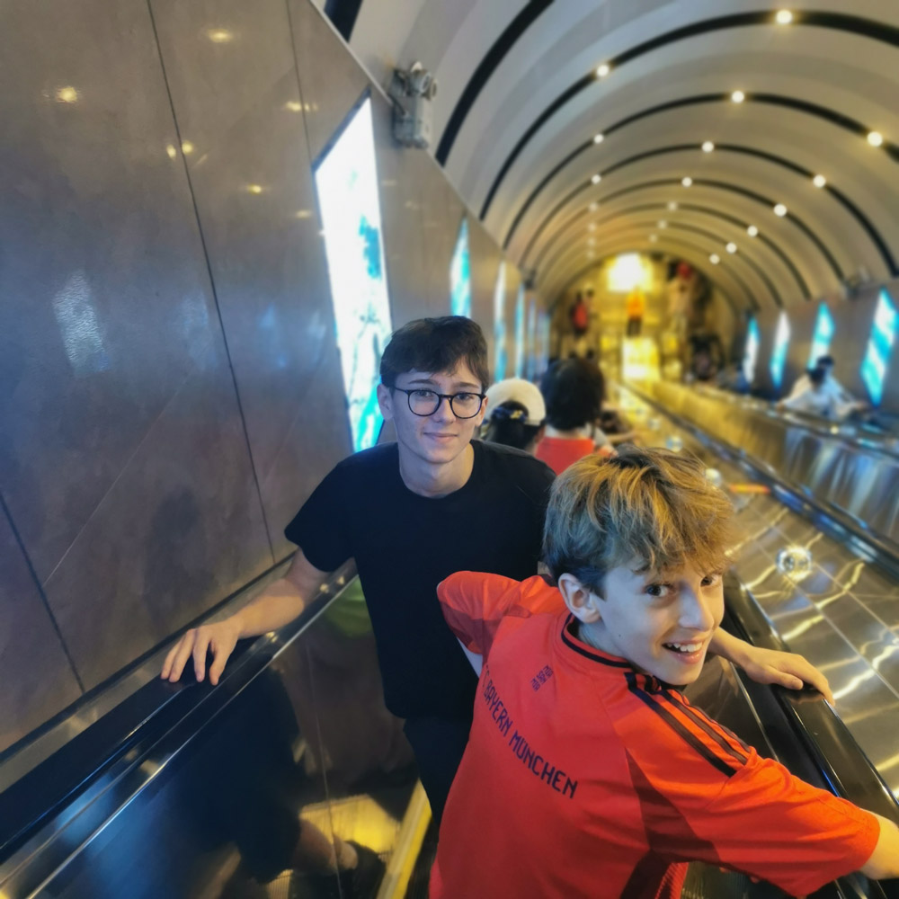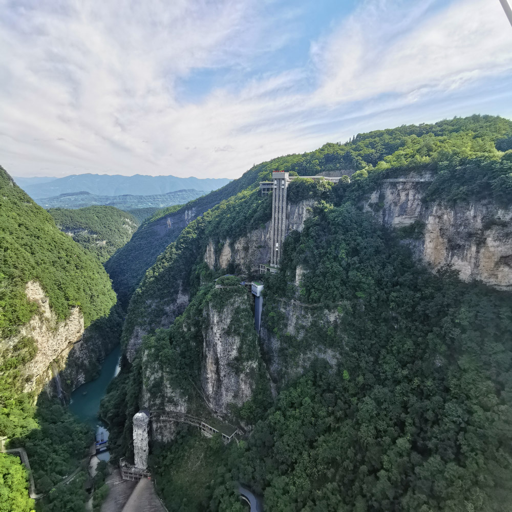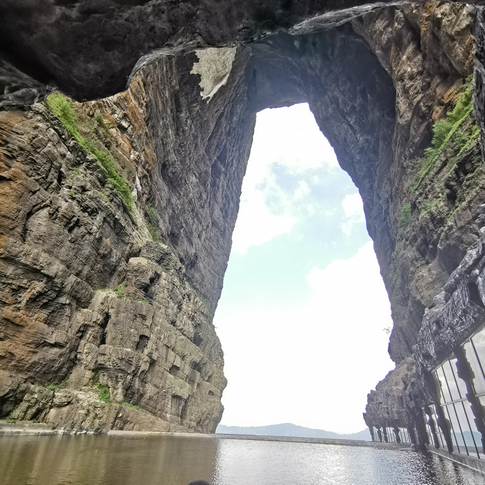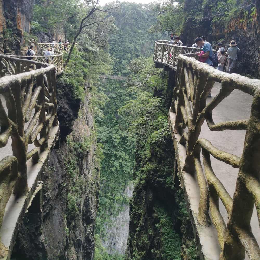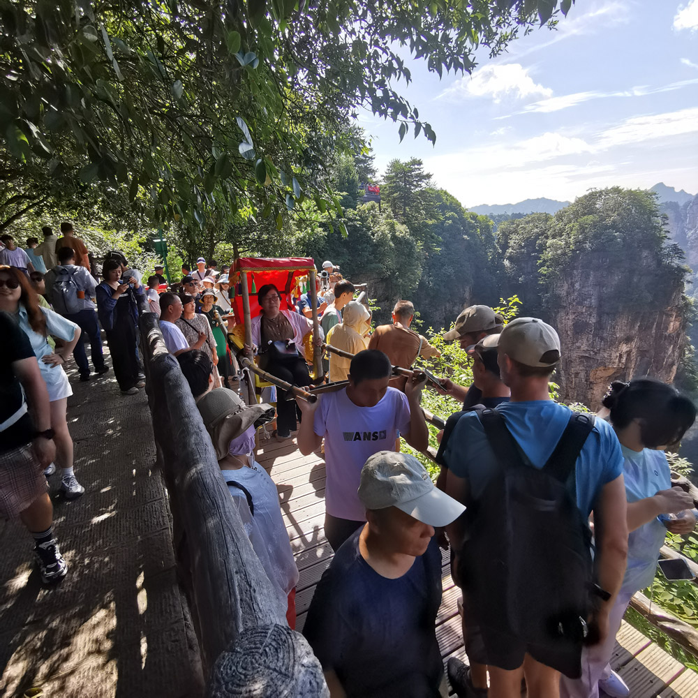 In Hunan, im Zentralosten von China, brachte uns die steilste und längste Seilbahn der Welt (7,4 Kilometer) auf den heiligen Berg Tianmenshan im Zhangjiajie-Nationalpark. Nach einem großen Rundweg, teilweise mit Glasboden, ging es dann im Inneren des Berges – mit tausenden anderen Menschen – auf einer bunt beleuchteten Rolltreppe hinab zum „Himmelstor“ im Fels. Von dort aus ging es 999 Stufen runter zur Aussichts-Terrasse.