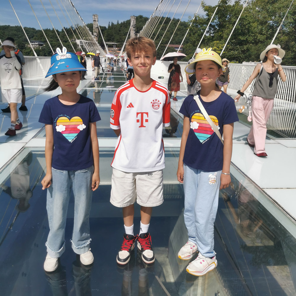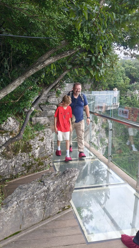 Wieder nichts für schwache Nerven: die 430 Meter lange Glasbrücke, 300 Meter über dem Canyon von Zhangjiajie. Im Zickzack-Stechschritt überquere ich die Brücke, während meine Männer immer wieder stehenbleiben und den Blick durch den Glasboden genießen. Wer auf der anderen Seite noch Nervenkitzel braucht, kann sich an eine Seilwinde hängen und über den Canyon zurücksausen. Flo, der einzige von uns, der das unbedingt erleben wollte, durfte nicht, dafür hätte er in den letzten Tagen auf das gute Essen verzichten müssen. Wir nehmen stattdessen die Familien-Rutsche (für mich als Speed-Junkie genau richtig :-))