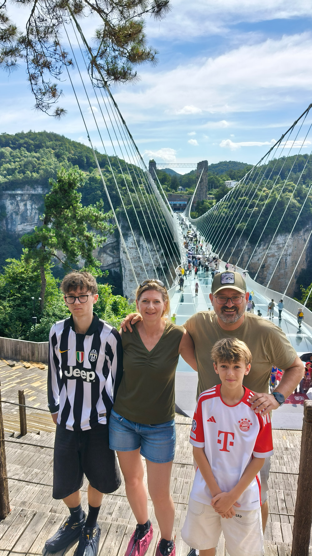 Wieder nichts für schwache Nerven: die 430 Meter lange Glasbrücke, 300 Meter über dem Canyon von Zhangjiajie. Im Zickzack-Stechschritt überquere ich die Brücke, während meine Männer immer wieder stehenbleiben und den Blick durch den Glasboden genießen. Wer auf der anderen Seite noch Nervenkitzel braucht, kann sich an eine Seilwinde hängen und über den Canyon zurücksausen. Flo, der einzige von uns, der das unbedingt erleben wollte, durfte nicht, dafür hätte er in den letzten Tagen auf das gute Essen verzichten müssen. Wir nehmen stattdessen die Familien-Rutsche (für mich als Speed-Junkie genau richtig :-))
