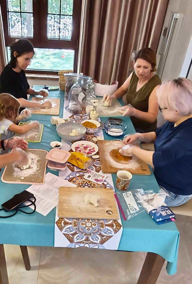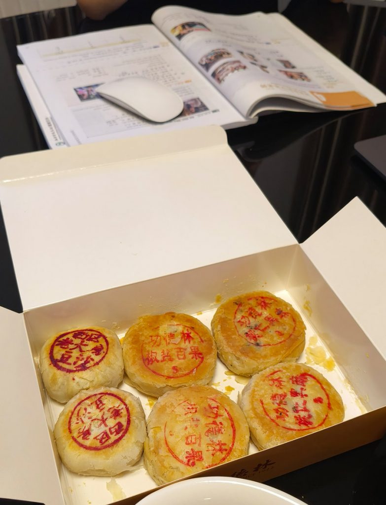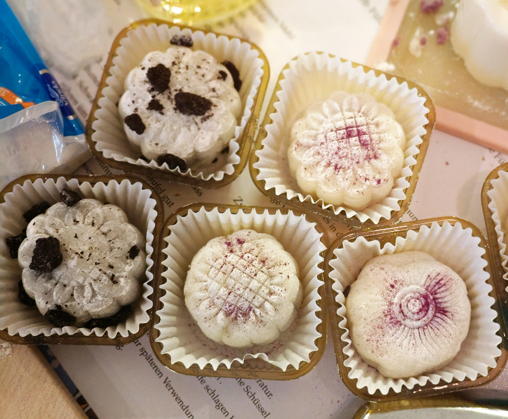 Traditionell werden am Mondfest bunte Laternen aufgehängt und man schenkt sich schon Tage vorher gegenseitig Schachteln mit Mondkuchen. Jede Bäckerei verkauft sie, jede hat ihr eigenes Rezept. Es gibt sie mit ganz verschiedenen salzigen oder süßen Füllungen. Einfach kaufen, reinbeißen und überraschen lassen. Oder selbst machen. Das habe ich in den letzten Tagen auch fleißig getan und – wider der Tradition – viele selbst verspeist.