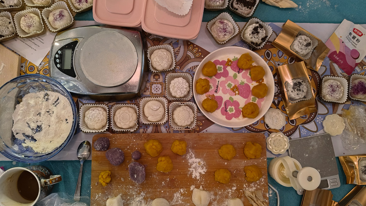Traditionell werden am Mondfest bunte Laternen aufgehängt und man schenkt sich schon Tage vorher gegenseitig Schachteln mit Mondkuchen. Jede Bäckerei verkauft sie, jede hat ihr eigenes Rezept. Es gibt sie mit ganz verschiedenen salzigen oder süßen Füllungen. Einfach kaufen, reinbeißen und überraschen lassen. Oder selbst machen. Das habe ich in den letzten Tagen auch fleißig getan und – wider der Tradition – viele selbst verspeist.