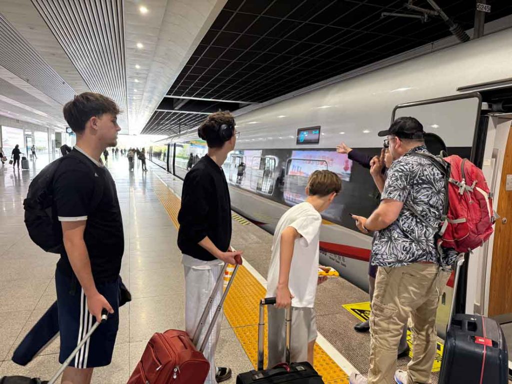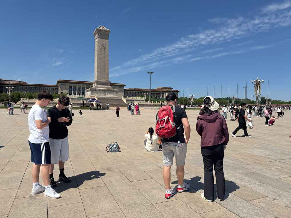Der Jinghu-Hochgeschwindigkeitszug schafft die 1.318 Kilometer von Shanghai nach Peking in 4 Stunden und 32 Minuten – und bringt uns am Samstag auf die Minute pünktlich ans Ziel. Unterwegs kann man per Handy u. a. Subway-Sandwiches bestellen, die wohl bei den Zwischenstopps an Bord genommen werden. Mit uns auf Reisen: Florians Neffe und frisch gebackener Abiturient Leander.