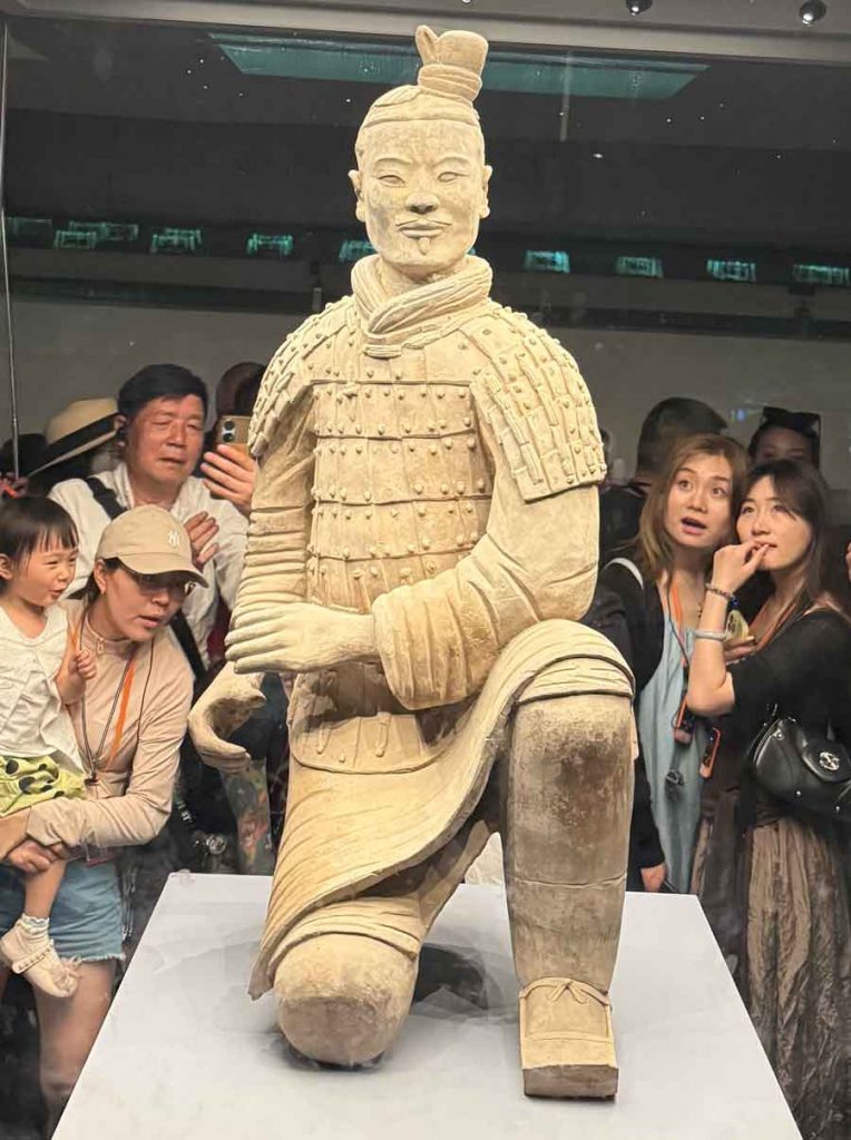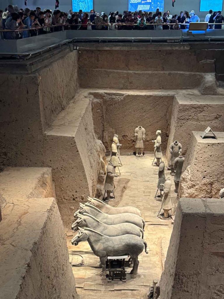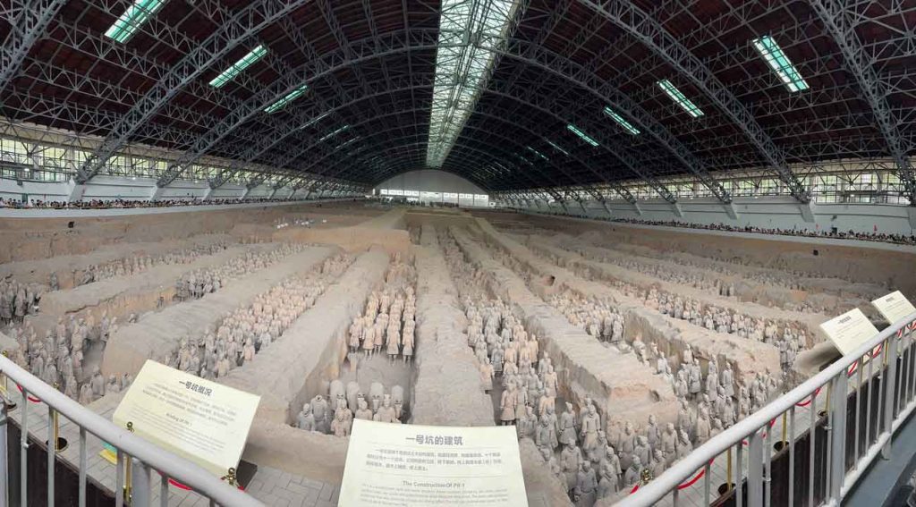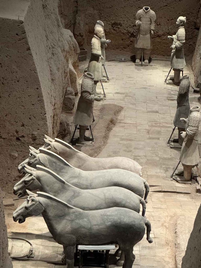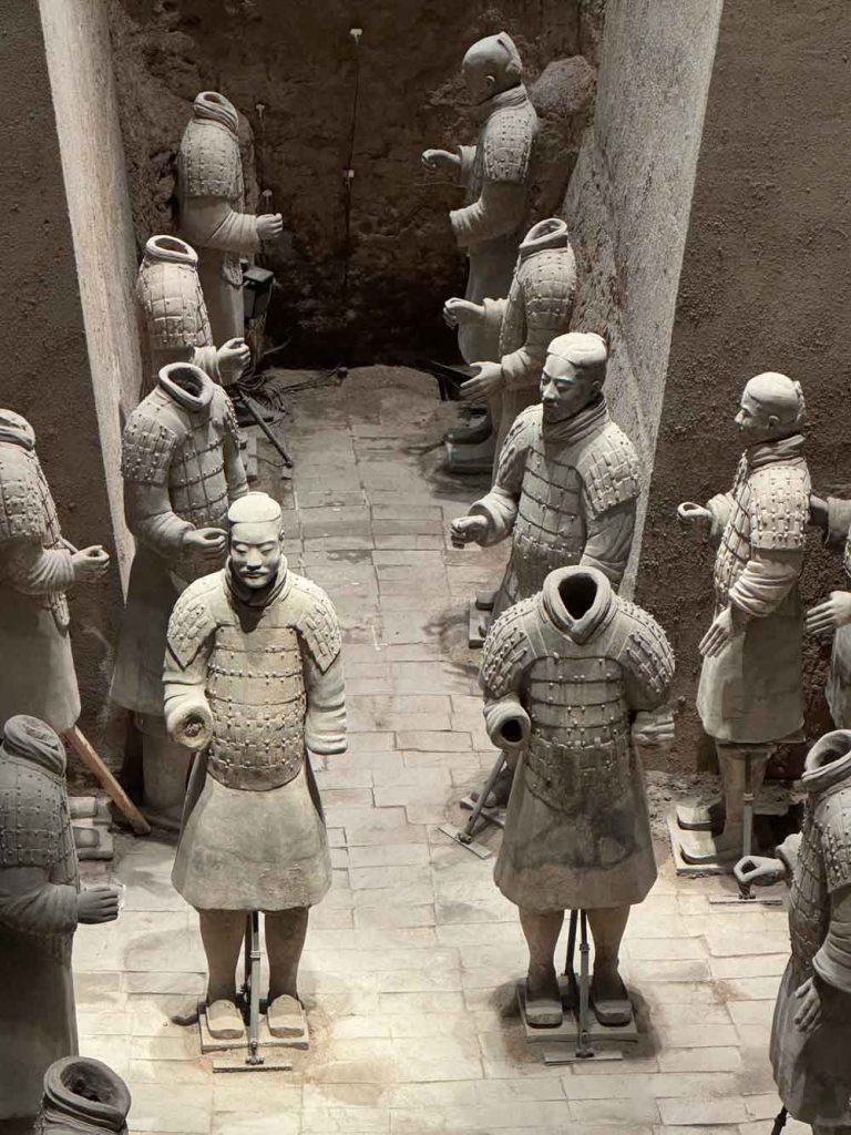 Xi’an – von dieser Stadt im Nordwesten haben wir zuvor noch nie etwas gehört. Aber die Stadt hat ja auch nur 13 Millionen Einwohner 😂. Sie ist der östliche Endpunkt der Seidenstraße und natürlich Ausgangspunkt für unseren Besuch der Terrakotta-Armee. Diese bekämen wir zu sehen, so unser Reiseführer Herr Ma, wenn wir sehr geduldig seien. Und so ist es dann auch: Die Massen schieben uns in der großen Halle ganz langsam Richtung Absperr-Gitter und dann ganz plötzlich wird die Sicht frei auf die riesige Streitmacht aus Generälen, Bogenschützen, Fußsoldaten und Wagenlenker, die den ersten Kaiser Chinas nach seinem Tod beschützen sollten.