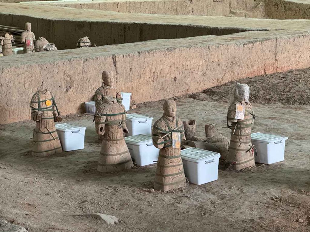 Ein paar Fakten: Die lebensgroßen Fuß- und Reitsoldaten sind alle individuell, sie haben alle unterschiedliche Gesichter. Mehr als 700.000 Zwangsarbeiter bauen 36 Jahre an der Grabstätte. Entdeckt wurde sie 1974 von einem Bauern, der einen Brunnen graben wollte. Seither wurden ca. 2.000 Krieger ausgegraben, schätzungsweise 6.000 sind noch immer begraben und viele werden es wohl vorerst auch bleiben, um sie zukünftig mithilfe noch modernerer Technologien freizulegen. Die Terrakotta-Armee bezeichnete Jacques Chirac als achtes Weltwunder.
