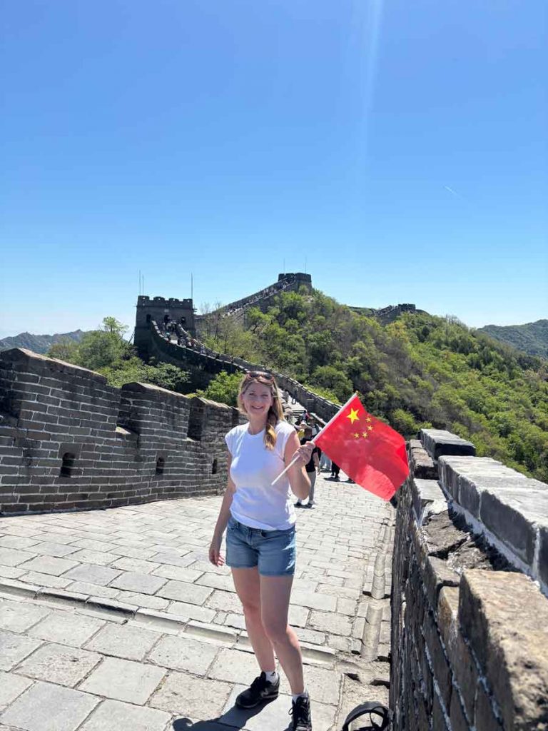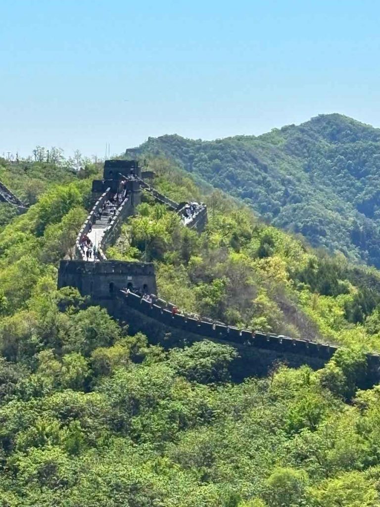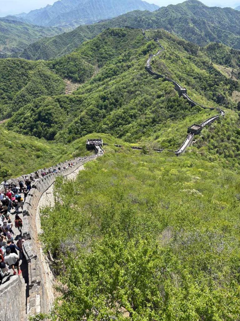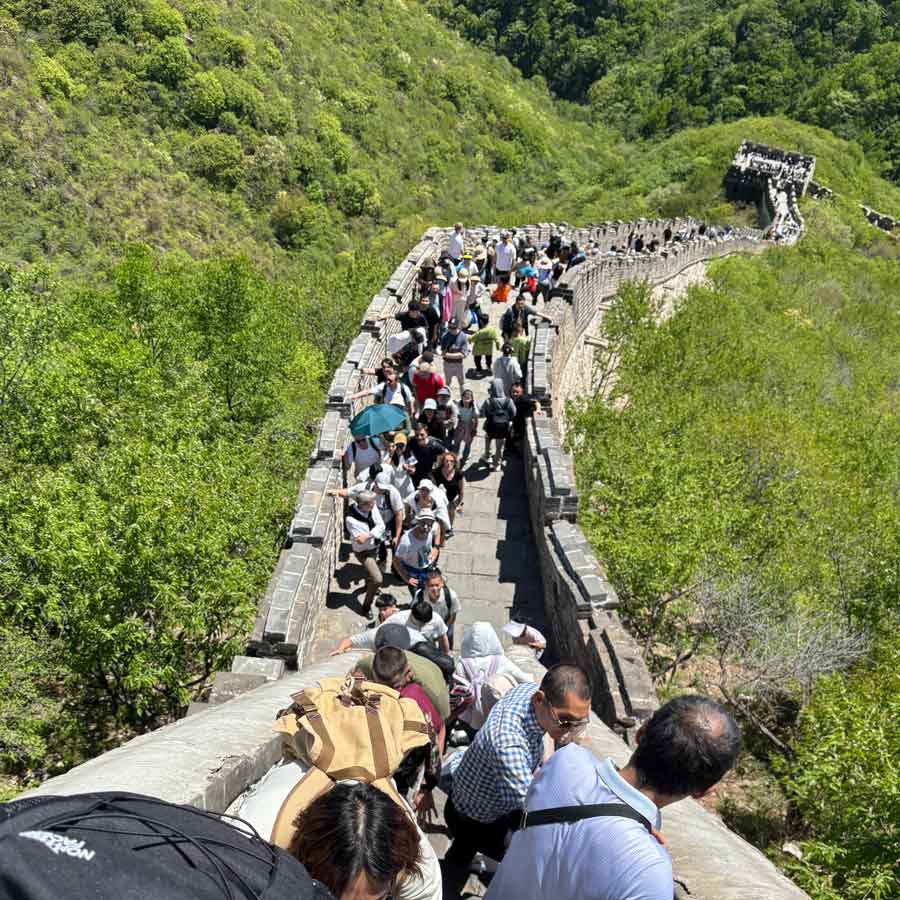 Zum Mutianyu-Abschnitt der Chinesischen Mauer gelangen wir mit der Gondel. Der Anblick der vielen Wachtürme auf den Berghängen ist beeindruckend. Wie zu erwarten, sind mit uns unzählige Touristen unterwegs, an den Wachtürmen ist das Gedränge groß. Ich halte immer wieder inne und versuche den Trubel auszublenden, um dieses gigantische Bauwerk auf mich wirken zu lassen. Wer weiß, ob ich nochmal herkomme. Schon irre, denke ich, dass wir auf nur einem kleinen Teil der gesamten Mauer stehen, alle Abschnitte zusammen ergeben eine Strecke von 21.196 Kilometern.