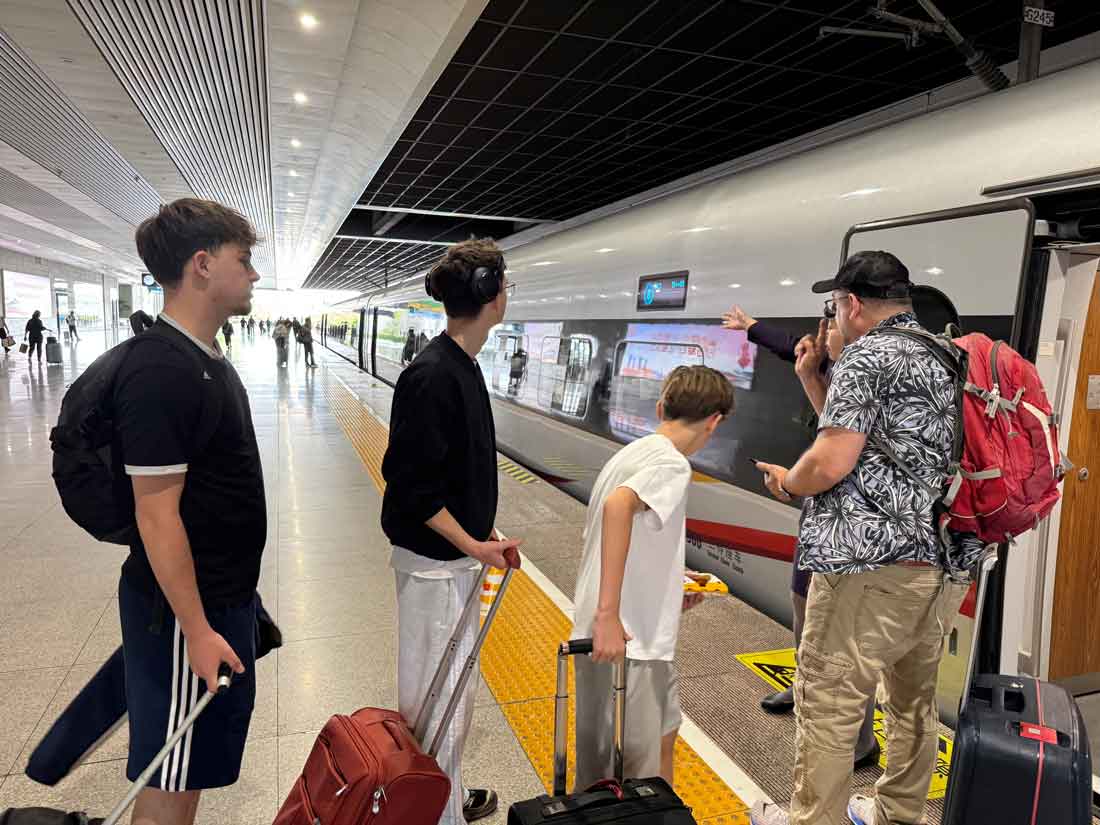 Der Jinghu-Hochgeschwindigkeitszug schafft die 1.318 Kilometer von Shanghai nach Peking in 4 Stunden und 32 Minuten – und bringt uns am Samstag auf die Minute pünktlich ans Ziel. Unterwegs kann man per Handy u. a. Subway-Sandwiches bestellen, die wohl bei den Zwischenstopps an Bord genommen werden. Mit uns auf Reisen: Florians Neffe und frisch gebackener Abiturient Leander.