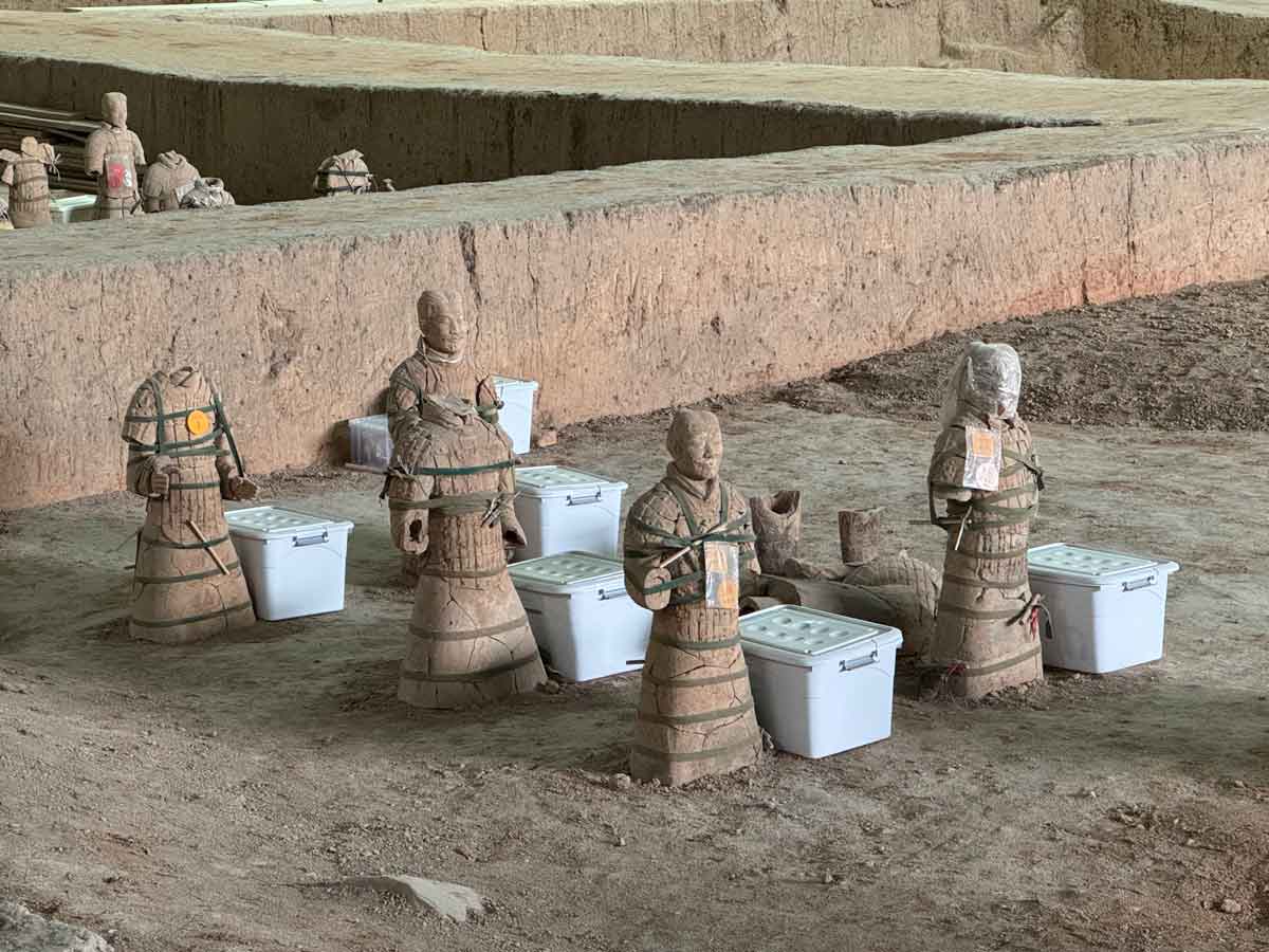 Xi’an – von dieser Stadt im Nordwesten haben wir zuvor noch nie etwas gehört. Aber die Stadt hat ja auch nur 13 Millionen Einwohner 😂. Sie ist der östliche Endpunkt der Seidenstraße und natürlich Ausgangspunkt für unseren Besuch der Terrakotta-Armee. Diese bekämen wir zu sehen, so unser Reiseführer Herr Ma, wenn wir sehr geduldig seien. Und so ist es dann auch: Die Massen schieben uns in der großen Halle ganz langsam Richtung Absperr-Gitter und dann ganz plötzlich wird die Sicht frei auf die riesige Streitmacht aus Generälen, Bogenschützen, Fußsoldaten und Wagenlenker, die den ersten Kaiser Chinas nach seinem Tod beschützen sollten.
