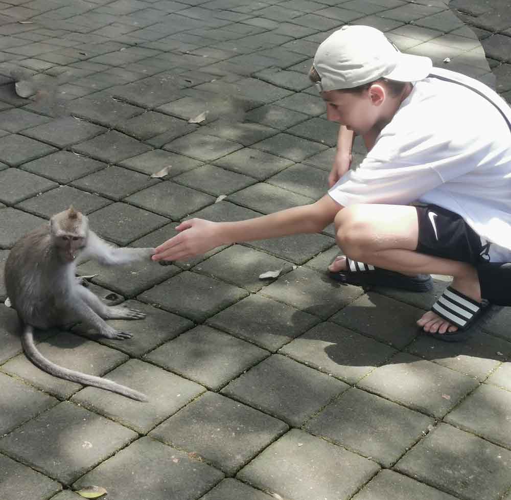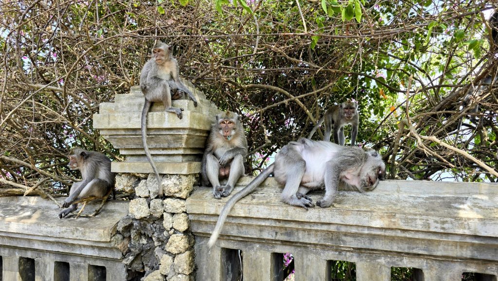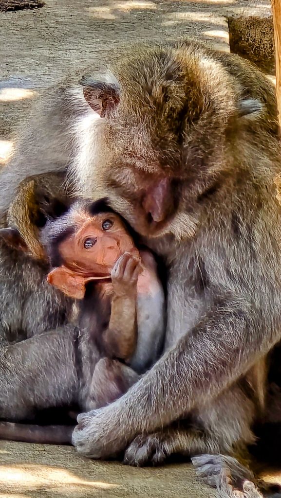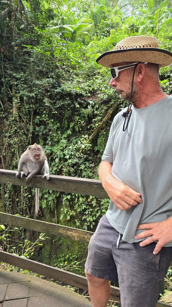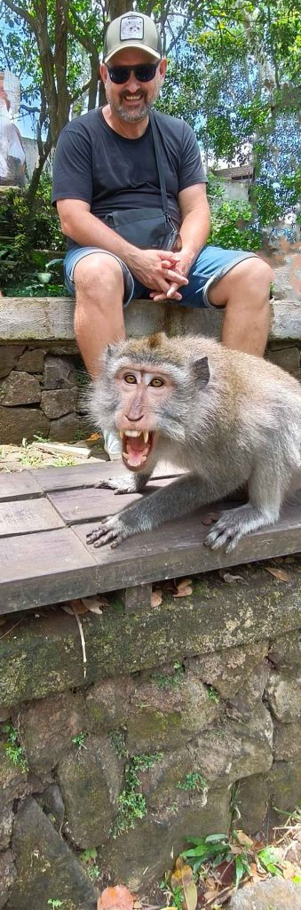 Auch den vollen Affenspass hat Bali zu bieten: Nuckelnde Babyaffen und listige Exemplare, die erst nach langen Verhandlungen geklaute Sonnenbrillen gegen Obst zurücktauschen. Es gibt zutrauliche Exemplare, die einem High Five geben und auf den Schoss klettern, aber auch welche, die ihre Zähne fletschen. Respekt vor meiner Schwägerin, die es im Angesicht dieser Reißzähne trotzdem geschafft hat, einem Affen ein giftiges Plastikstück aus dem Mund zu entlocken. Und für mich gab es Affenpipi auf den Kopf.