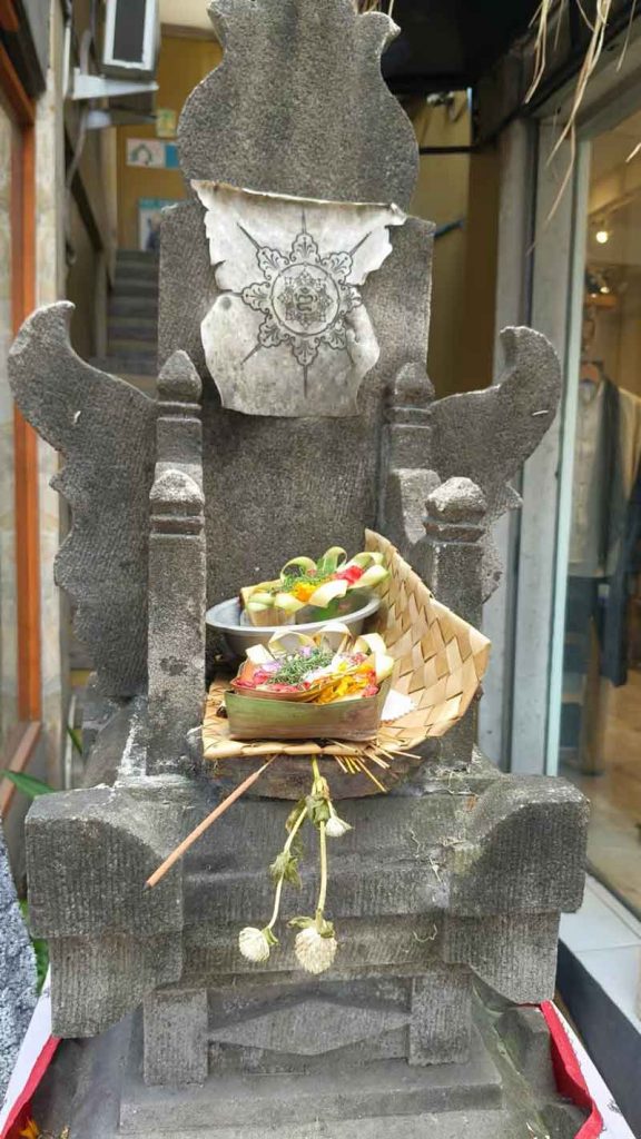 Neben den großen Tempelanlagen, scheint jedes Häuschen einen eigenen, kleinen Tempel zu haben. Jeden Tag stellen die Menschen frische Opfergaben für die Götter raus: Körbchen aus Palmenblättern oder Kokosblättern mit frischen Blumen, Geld, Keksen oder Reis sowie Räucherstäbchen und Heiligem Wasser.